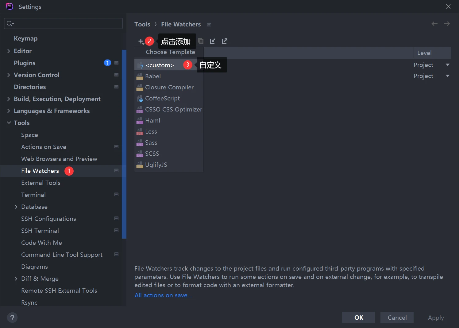 进入设置,找到File Watchers,添加一个自定义项目